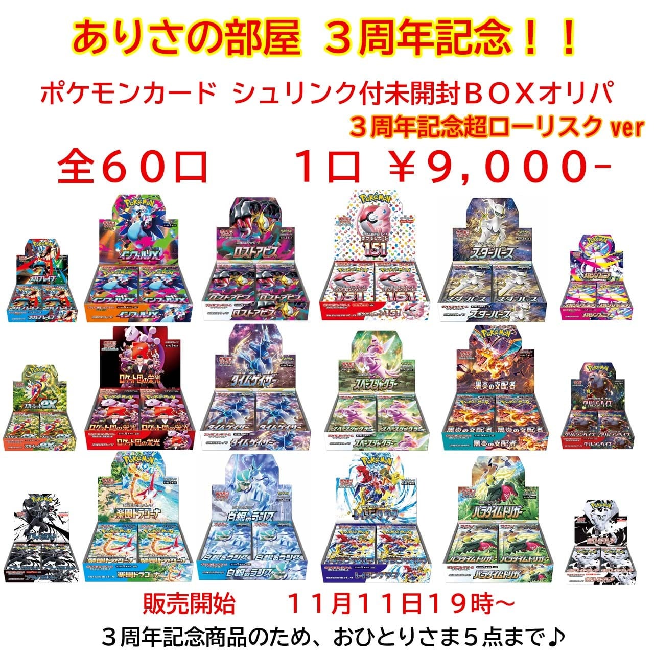 3周年記念!! ポケモンカード シュリンク付 未開封BOXオリパ 3周年記念超ローリスクver 1口 9000円 全60口