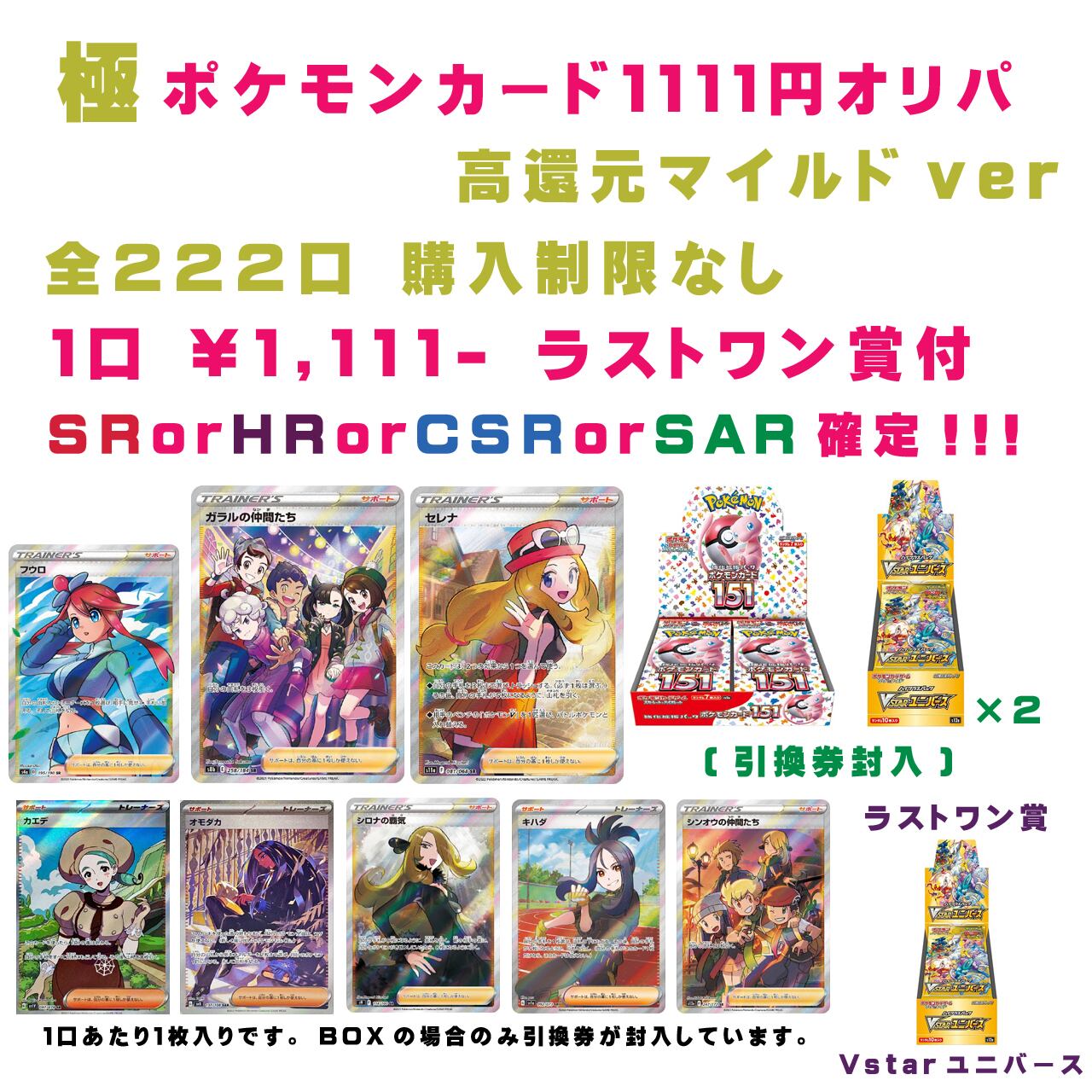 極 ポケモンカード 1111円オリパ 高還元マイルドver 全222口 オリパ ラストワン賞付 BOX賞アリ ポケットモンスター シングルカード